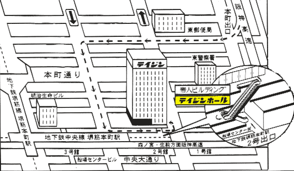 | 会場:テイジンホール TEL:06-6268-3131 〒541-8587 大阪府大阪市中央区南本町1丁目6番7号 帝人ビル2階 地下鉄中央線・堺筋線「堺筋本町」東出口(2号出口)から専用通路あり>>図 |